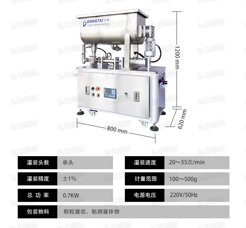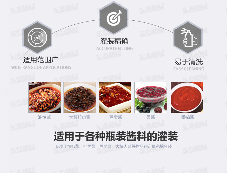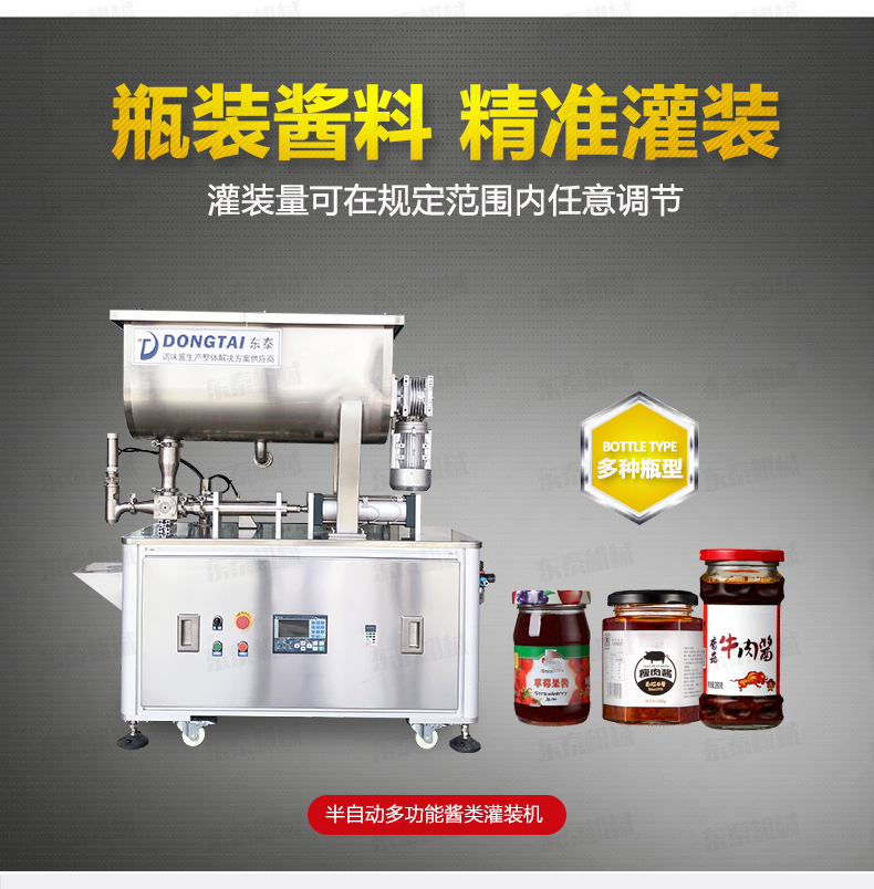 本單頭醬料灌裝機專用于辣椒醬、拌面醬、豆瓣醬、大塊肉醬等物品的定量充填分裝,適合于將各類粘稠體及含有各種固體物質如辣椒、花生、肉塊、佐料等物體的醬類灌裝于各種容器中,適用于各種瓶裝醬料的灌裝。