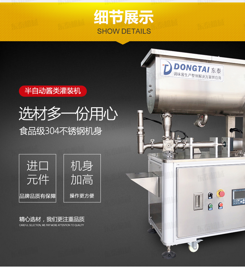 7.加高不銹鋼機身:單頭醬料灌裝機機身整體加高,操作更方便,食品級304不銹鋼機身,符合國家食品級衛生標準