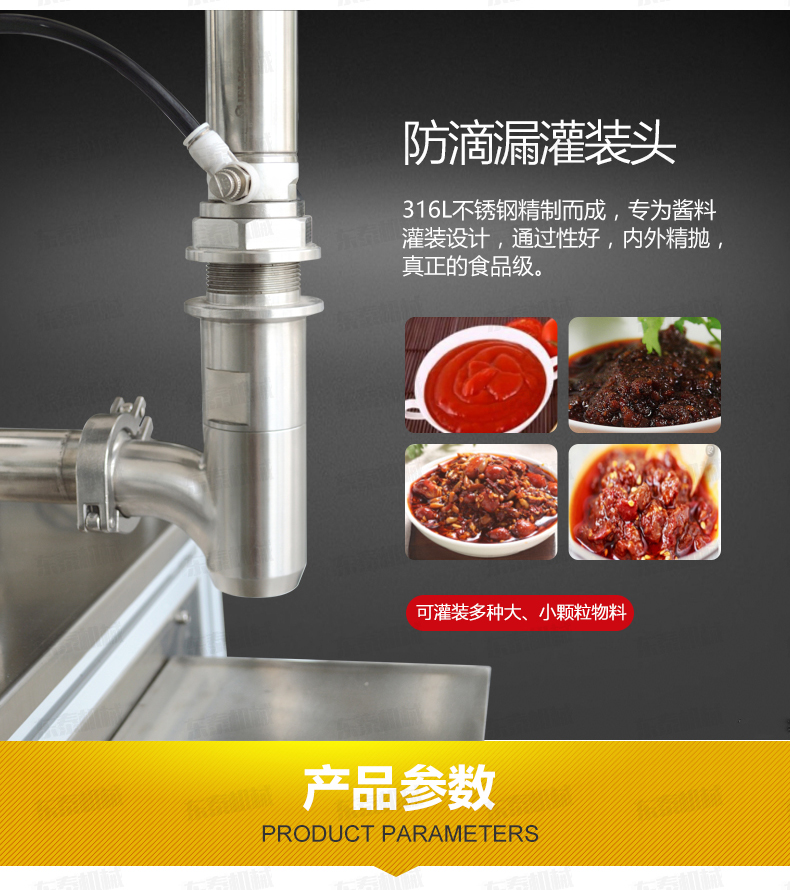1.防滴漏灌裝頭 :316L不銹鋼精制而成,專為醬料灌裝設計,通過型好,內外精拋,真正的食品級