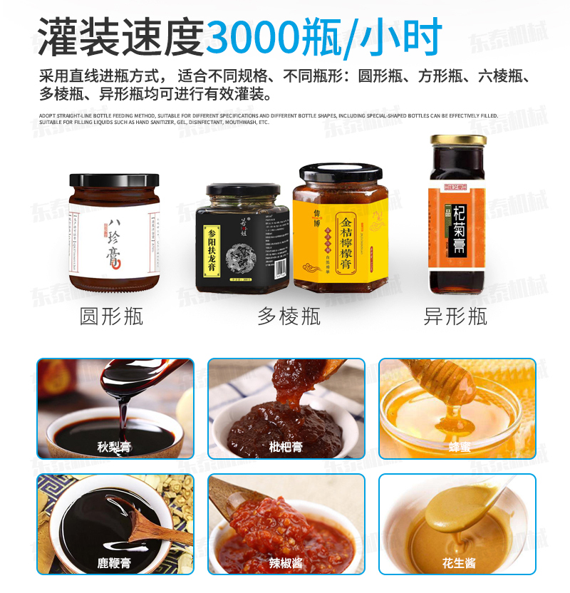 枇杷膏灌裝機生產(chǎn)線適用于各種1、各種膏滋如:秋梨膏、枇杷膏、鹿鞭膏、蜂蜜等的灌裝。2、調(diào)味醬如:香菇醬、辣椒醬、豆瓣醬、花生醬、芝麻醬、牛油火鍋底料、紅油火鍋底料。3、采用多規(guī)格的灌裝轉閥、灌裝頭,可適應不同客戶物料的灌裝需求。