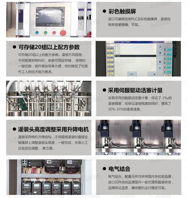 2、本機由可編程控制器(PLC)配合智能觸摸屏(人機界面)控制,人性化的設計使調整灌裝量及修改各種參數等操作均十分簡單、快捷、直觀;