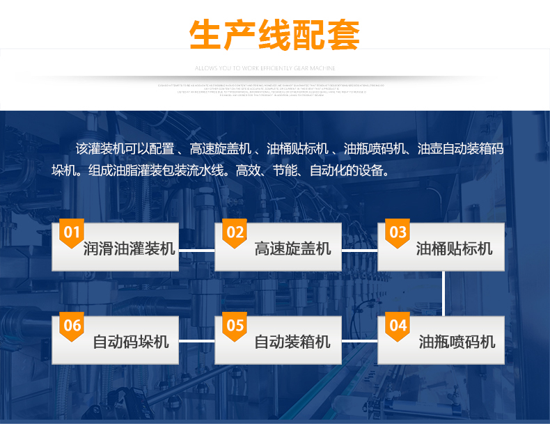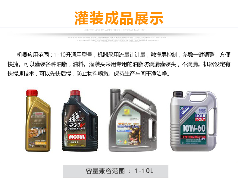 該大型潤滑油灌裝機(jī)采用容積式計(jì)量灌裝原理,適用于各種規(guī)格(1-5L)的液體肥等液體灌裝。設(shè)備采用伺服驅(qū)動(dòng)活塞計(jì)量,保證了 1‰的灌裝,在保證灌裝的同時(shí),提高了 20%-35%的灌裝速度,操作簡(jiǎn)單,維護(hù)方便,節(jié)省人工成本,生產(chǎn)效率更高。
