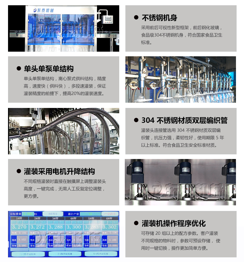 驅動方式更是通過伺服電機配合滾珠絲杠帶動相應料缸內的活塞做往復運動,從而讓料缸前腔產生負壓,以電機脈沖控制電機旋轉并控制活塞行程,從而調節灌裝量。驅動的方式應用于容積柱塞式灌裝方式,這種灌裝方式和物料接觸部分均為不銹鋼316L 材質,灌裝過程中無污染,各物料轉換清洗方便,車間灌裝結束設備維護清洗便捷,大大優于自流其他灌裝方式。氣缸驅動相比伺服驅動針對灌裝的計量范圍更加廣泛靈活,針對客戶多種灌裝規格的需求服驅動方式調整方便,僅需在觸摸屏上設置即可,一般出廠可以根據客戶常用規格直接寫入程序。伺服驅動方式灌裝速度快,不受氣壓的影響,灌裝速度可控。總之:伺服驅動方式在操作使用、精度誤差、整機調整、設備清洗、維護保養等方面更加方便客戶使用。并且我們公司有著優質的售后服務團隊為您以后的使用保駕護航。